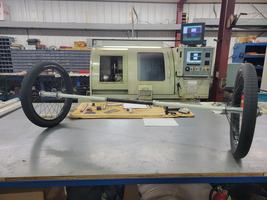 The running/suspension gear for the glider is done. The entire assembly weighs in at 6#2.2oz. With a slight modification we can decrease that by almost 5.3oz. though. The wheels are 20″ Rant Squad Rims. The spokes and nipples are titanium from PorkchopBMX. The tires are Shadow Conspiracy Serpents. The wheel bushings are from Oiles America Corp. The axle is from Liberty Pultrusion and is a Carbon Polyglass combo EHS…Super strong but flexible. And the innertubes…OMG the tubes you won’t believe!