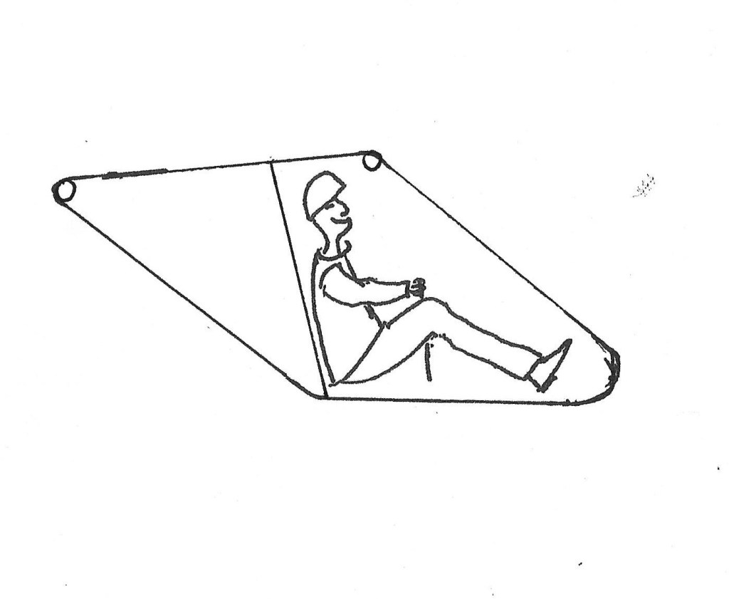 Here you can see the pilot pod frame. Don’t beat me up about the measurements, they are currently just very rough estimates. The lower tubes will be 18″ apart and will be partially held together in parallels by the adjustable wheel location slider, the adjustable seat slider and the adjustable joy stick slider. In addition the rudder pedal cross member will be a strengthening member. The pilot pod frames will be tilted out to parallels at 32″ apart on the top. For the sake of description try to picture 32″ long tubes fore and aft with a wing panel and a batten on each side. The wing leading and trailing edge will plug into these tubes.
